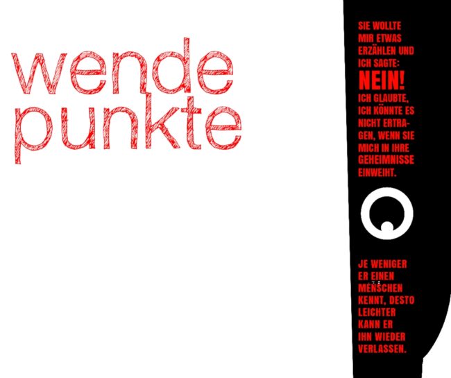 Wendepunkte. Eine Theatercollage [2016] Texte: Florian L. Arnold, W. Schwarz Dramatisierung: Marion Weidenfeld VorstattTheater Ulm UA: 8. 12. 2016, Ulm Ich freue mich, daß marion Weidenfeld und ich den Abend „Wendepunkte“ gestalten konnten, dem Werner Schwarz die emotionelle und aufwühlende Szene einer Beziehungskrise hinzufügt. Ein Theaterabend, der den Besucher unterhält, auch zum Lachen bringt, dabei…