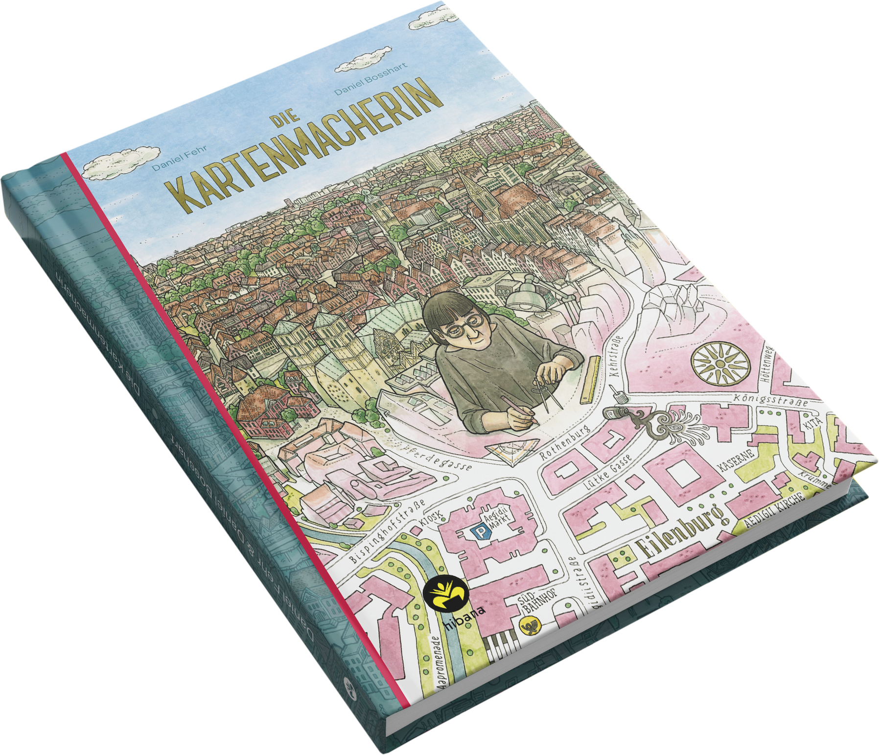 Das Schweizer Duo Daniel Fehr und Daniel Bosshart behandelt mit subtilem Zeichenstift und hintersinniger Erzählung das Thema Stadtentwicklung und Stadtgestaltung auf. Der Humor kommt in diesem Buch nicht zu kurz. Und darum geht es: Das kleine Eilenburg weiht einen Südbahnhof ein – und stellt dabei entgeistert fest, daß es gar nicht so klein ist wie angenommen. Es gibt bereits einen Südbahnhof, weiter nördlich. Um also einen Überblick über die Stadt zu bekommen, wird eine Kartenmacherin eingestellt. Deren Methoden aber sind alles andere als gewöhnlich …