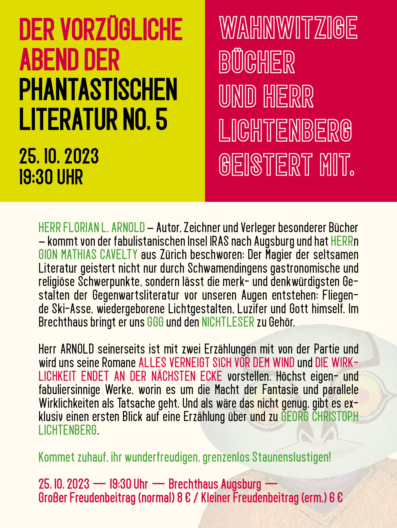 Herr ARNOLD seinerseits ist mit zwei Erzählungen mit von der Partie und wird uns seine Romane ALLES VERNEIGT SICH VOR DEM WIND und DIE WIRKLICHKEIT ENDET AN DER NÄCHSTEN ECKE vorstellen. Höchst eigen- und fabuliersinnige Werke, worin es um die Macht der Fantasie und parallele Wirklichkeiten als Tatsache geht. Und als wäre das nicht genug, gibt es exklusiv einen ersten Blick auf eine Erzählung über und zu Georg Christoph Lichtenberg.